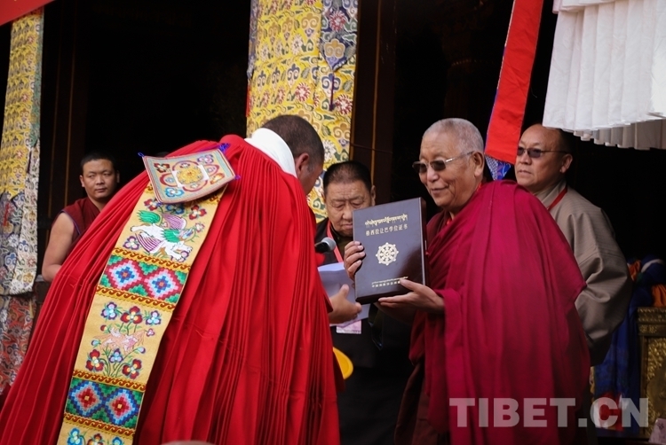 在頒證儀式上,西藏自治區(qū)政府副秘書長高寶軍,西藏自治區(qū)黨委統(tǒng)戰(zhàn)部常務(wù)副部長、自治區(qū)宗教事務(wù)局局長趙樹明受自治區(qū)領(lǐng)導(dǎo)委托,代表西藏自治區(qū)人民政府向獲得學(xué)位的考僧贈送五彩緞、干果、袈裟和禮金。佛協(xié)西藏分會副會長、扎什倫布寺堪布噶欽?多吉堅(jiān)贊致賀詞,并代表班禪額爾德尼?確吉杰布會長向獲得學(xué)位的考僧獻(xiàn)哈達(dá),頒發(fā)學(xué)位證書。