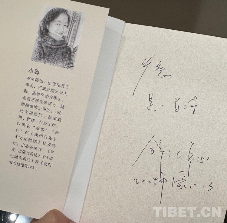 用餐結(jié)束后,卓瑪姐送我們每人一本她最新創(chuàng)作的詩(shī)集《昨天和明天都會(huì)回來(lái)》,并在扉頁(yè)親手寫上寄語(yǔ),每人的寄語(yǔ)都不同。她在贈(zèng)予帕洛扎的書上寫著“鄉(xiāng)愁,是一首詩(shī)”,給我寫著“走著走著別把自己走丟了”,給浩然寫著“別輕視 弱小的溫柔”……每條寄語(yǔ),都寄托著卓瑪姐他鄉(xiāng)遇故知的溫暖與感動(dòng)。對(duì)于西藏,我想卓瑪姐與帕洛扎一樣,都已經(jīng)把它當(dāng)成了自己深愛的故鄉(xiāng)。西藏承載著她兒時(shí)的記憶,小時(shí)候居住過的水泥廠、上學(xué)時(shí)走過的路、拉中的老師同學(xué)……那些或欣喜或難忘的往事,都是她與西藏這片土地最真實(shí)的情感連接,這種情懷,無(wú)法割舍,更不能割舍。(中國(guó)西藏網(wǎng) 記者/呂靜 易文文 姚浩然 王東)