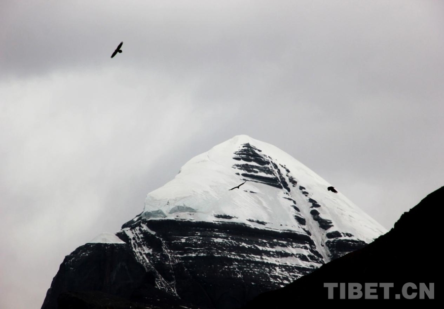 圖為位于西藏自治區(qū)阿里地區(qū)普蘭縣巴嘎鄉(xiāng)的岡仁波齊上空群鷹翱翔 攝影:劉莉