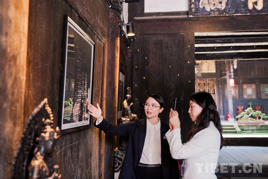 姜氏古茶第十五代傳承人萬姜紅(左)在中國西藏網視頻號直播時向廣大網友介紹姜家大院歷史和有關老照片的故事 楊洋供圖