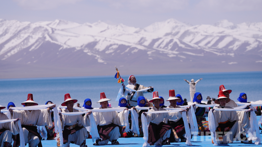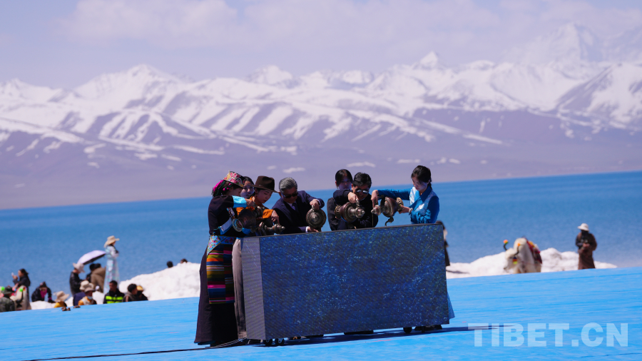 念青唐古拉山脈皚皚雪山高聳入云,清澈碧藍的納木錯湖水一望無際,牧民牽著白牦牛在湖邊悠閑地散步,成群的棕頭鷗發(fā)出歡快的叫聲在空中自由飛翔……在令人如癡如醉的絕美景色為背景的祈福儀式上,身著盛裝的300名演員結(jié)合當(dāng)?shù)孛袼孜幕?,手捧哈達、牛角、烏爾朵(拋石器)等呈現(xiàn)盛大的祈福儀式,給現(xiàn)場觀眾帶來一場羌塘高原別具一格的視覺盛宴。