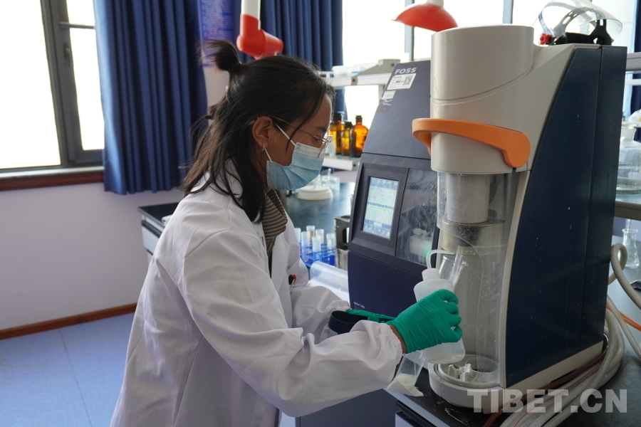 圖為畢業(yè)生尼瑪瓊決正在實(shí)驗(yàn)室檢測樣品肉的新鮮度 攝影:張曉琪
