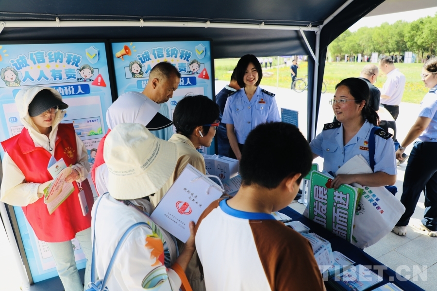 圖為稅務工作人員在向群眾講解 攝影:龍真多吉