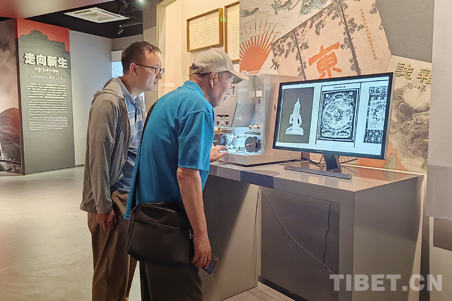 圖為紀(jì)念西藏江孜抗英保衛(wèi)戰(zhàn)120周年主題展現(xiàn)場(chǎng),觀眾通過膠片機(jī)了解被英國(guó)劫掠的西藏文物 攝影:楊月云