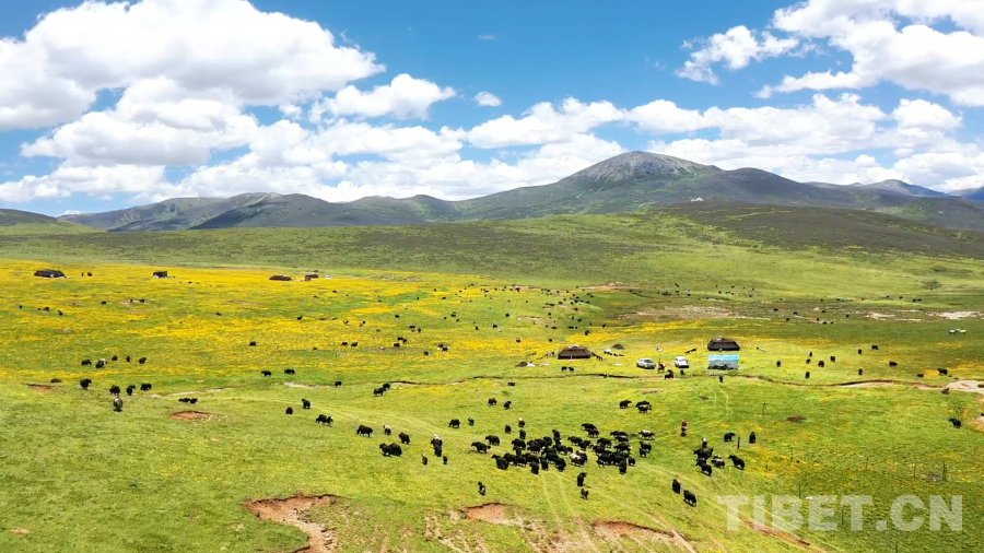 早晨天剛蒙蒙亮,他們就準(zhǔn)備出發(fā)了,一家人把生活必需品黑帳篷,火爐,鍋碗瓢盆,被褥及酥油糌粑等物資打包裝車,由家人先駕駛拖拉機(jī)把所有物資運(yùn)送到夏季遠(yuǎn)牧點(diǎn),四郎彭措則和他的侄兒騎馬趕牛出發(fā)。冬季牧場(chǎng)到夏季牧場(chǎng)距離60公里,他們經(jīng)過(guò)9個(gè)小時(shí)的遷徙,終于在下午3點(diǎn)到達(dá)夏季牧場(chǎng)。此時(shí)他的家人也在鄰居的幫助下搭好了帳篷,煮好了酥油茶等待著他們。到了夏季牧場(chǎng),牦牛們也迫不及待奔向了肥美的水草,四郎彭措和他的侄兒也終于可以卸下滿身的疲憊,品嘗家人們準(zhǔn)備好的美食。夏季牧場(chǎng)正是一年當(dāng)中最美的季節(jié),草原上開(kāi)滿了五顏六色的花朵,多日不見(jiàn)的好友也帶著自己的家人早一步駐扎在此地,四郎彭措說(shuō)道:“夏季放牧,轉(zhuǎn)場(chǎng)雖然辛苦,但也是一年中難得的閑暇時(shí)光。夏季水草肥美,牦牛們有充足的食物,來(lái)到夏季牧場(chǎng)放牧的牧民也有更多的活動(dòng)時(shí)間,賽馬、唱歌、跳鍋莊舞是我最喜歡的活動(dòng)?!?/p>