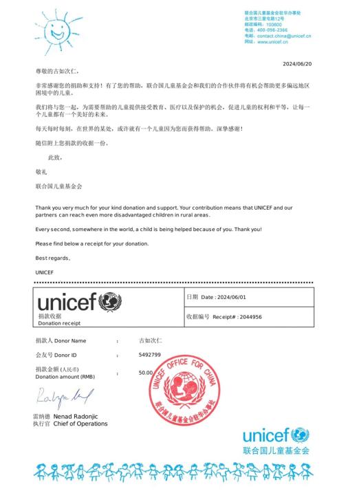 “之后的每個月我都會把省吃儉用節(jié)約下來的錢捐贈給聯(lián)合國兒童基金會,雖然每月捐贈的金額數(shù)不大,但我這幾年一直力所能及地堅持做著這件事?!惫湃绱稳收f,到大學后每月還有勤工儉學的收入,所以我會繼續(xù)堅持做這件事,能通過自己的方式幫助到貧困兒童非常有意義。