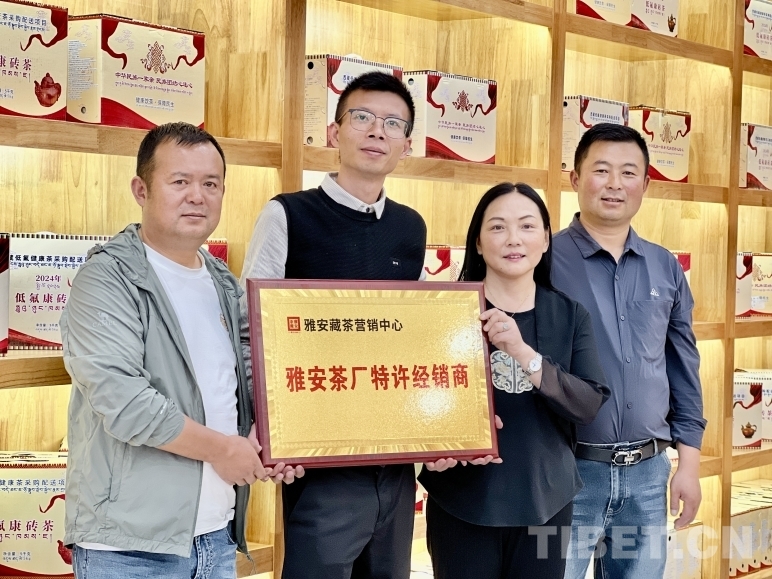 圖為頒發(fā)“雅安茶廠特許經(jīng)營(yíng)商”牌匾現(xiàn)場(chǎng) 攝影:德吉卓瑪
