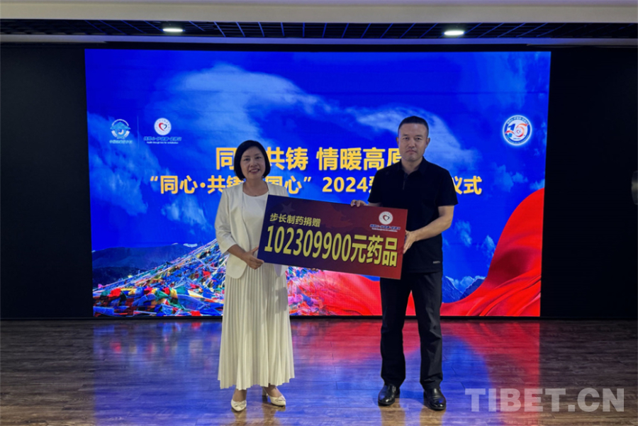 中國西藏網訊 8月5日,同心共鑄·情暖高原“同心·共鑄中國心”2024愛心捐贈儀式在北京舉行。步長制藥集團通過北京同心共鑄公益基金會向西藏、四川、云南、甘肅、青海等地的17個地市州的148個縣,無償捐贈呼吸道疾病防治藥——“宣肺敗毒顆?!?.78萬箱,共171.3萬盒,價值1.02億元。