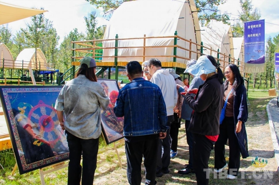 圖為參會人員參觀彩色青稞制作的青稞藝術作品