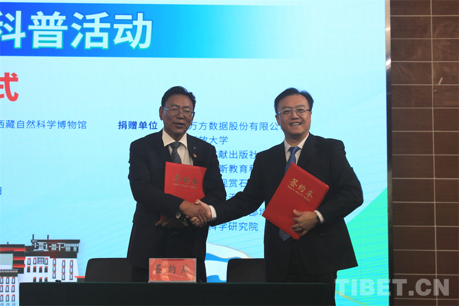 啟動(dòng)儀式后,來(lái)自北京、江蘇、上海及西藏當(dāng)?shù)氐?家企業(yè)和機(jī)構(gòu)為計(jì)劃提供科普資源捐助。8家資源捐贈(zèng)方代表與受贈(zèng)方西藏自然科學(xué)博物館分別簽訂捐贈(zèng)協(xié)議。