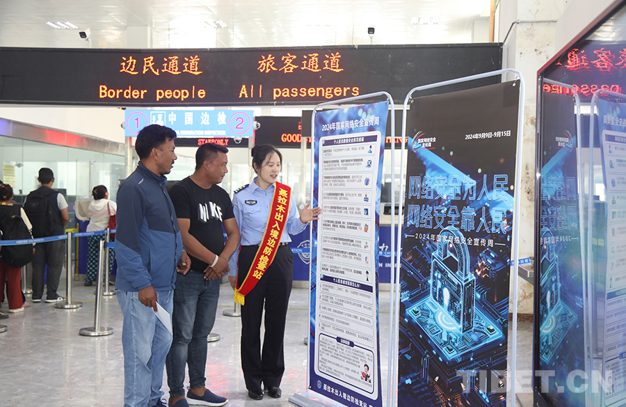 圖為聶拉木出入境邊防檢查站移民管理警察開展網(wǎng)絡(luò)安全周集中宣傳活動 攝影:高榮元