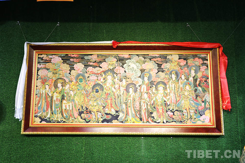 此次展覽中不僅有20余幅不同年代珍貴傳統(tǒng)唐卡,同時(shí)還重點(diǎn)展出了掐絲琺瑯唐卡。據(jù)相關(guān)負(fù)責(zé)人介紹,此類作品以傳統(tǒng)手工掐絲為基礎(chǔ),以金箔、金絲鑲嵌而成,制作技藝復(fù)雜、用料講究,風(fēng)格獨(dú)特且具有鮮明民族特點(diǎn)。兩種非遺的結(jié)合,是文化傳承與技術(shù)創(chuàng)新的生動(dòng)實(shí)踐,讓觀眾在觀賞中體驗(yàn)到非遺的魅力。