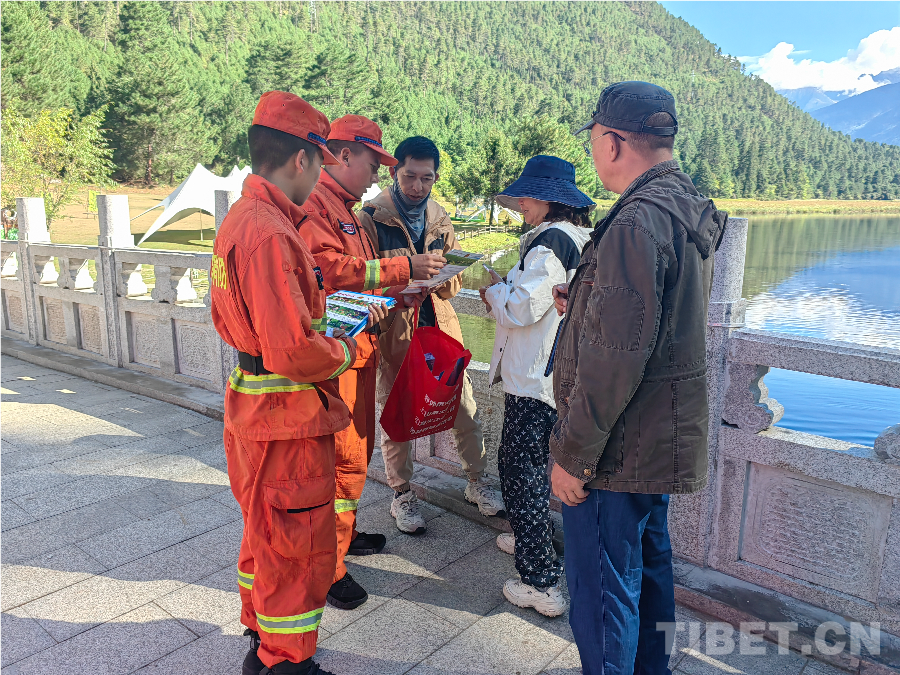 圖為波密縣森林消防員向游客講解森林防火常識(shí)