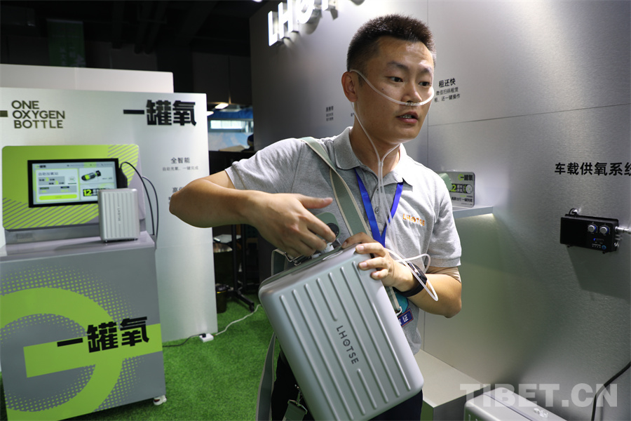 圖為318自駕游全國裝備展銷會上的工作人員正在講解如何使用高原上的氧氣背包 攝影:王妍丹