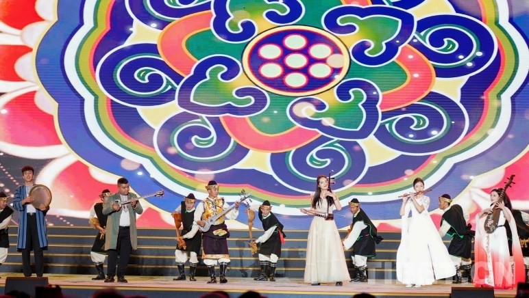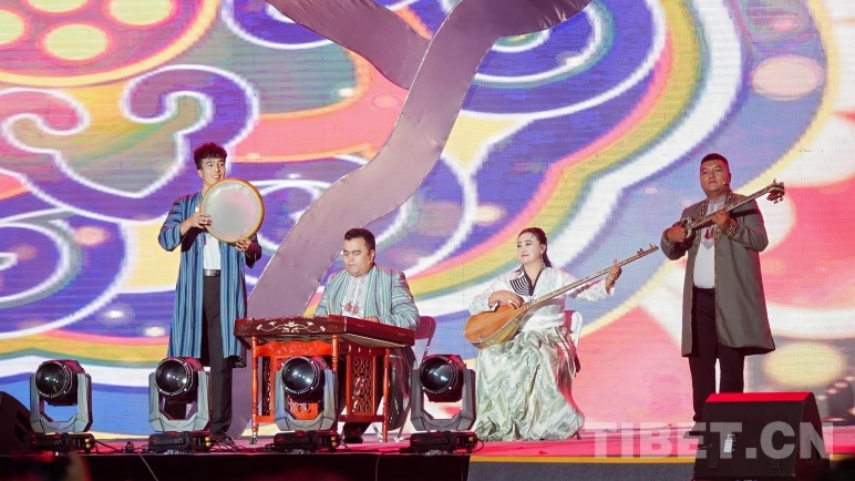 在“爭奇斗妍”篇中,珞巴族口弦、蒙古族馬頭琴,以及二胡、琵琶、竹笛等組成的新民樂組合輪番上演。由新疆喀什、和田的藝術家們帶來的、入選聯(lián)合國教科文組織“人類口頭和非物質遺產代表作”名錄的新疆維吾爾木卡姆藝術更是讓現(xiàn)場的觀眾耳目一新。在篇章的結尾,由各民族演奏者們共同演繹的工布民歌,將現(xiàn)場氣氛推向高潮,也讓民族間的交往交流交融在所有人心中留下了具象、生動的畫面。