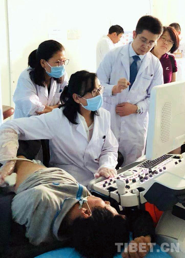 圖為夏宇(左三)援藏期間,在西藏自治區(qū)人民醫(yī)院超聲醫(yī)學科指導當?shù)蒯t(yī)生做超聲檢查工作(夏宇提供圖片)