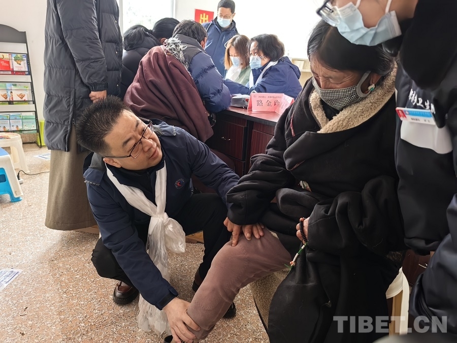圖為中國康復(fù)研究中心骨科專家唐鵬為當(dāng)?shù)厝罕娍丛\ 攝影:賈春玲