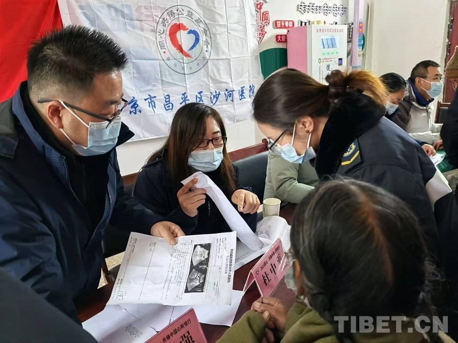 圖為北京市昌平區(qū)沙河醫(yī)院黨委書記李瑞強(qiáng),航空總醫(yī)院路金玲主任,北京復(fù)興醫(yī)院唐煜主任為當(dāng)?shù)匕傩账腿ノ繂栁镔Y 攝影:張曉雪