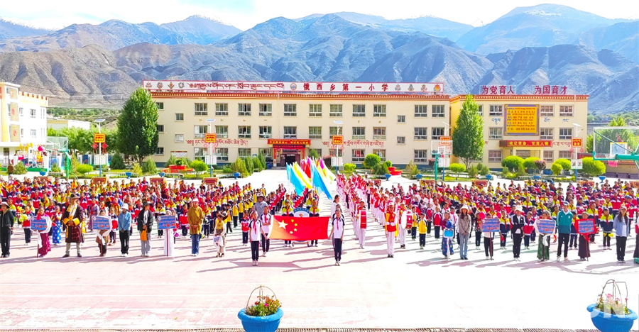 圖為西藏自治區(qū)昌都市洛隆縣俄西鄉(xiāng)第一小學(xué)開展升旗儀式等活動
