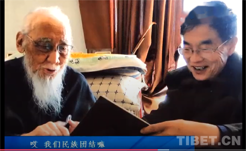 圖為恰白·次旦平措先生(左)與何宗英交流學(xué)術(shù)(視頻截圖) 作者供圖
