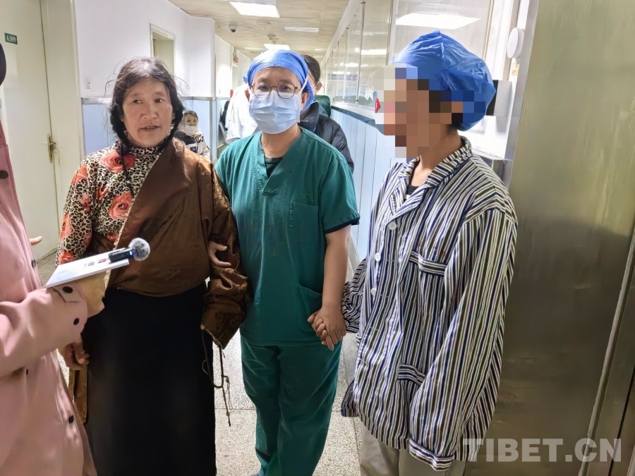 圖為手術剛剛結束后,卓瑪?shù)膵寢屌c卓瑪和醫(yī)生交流 攝影:王帥