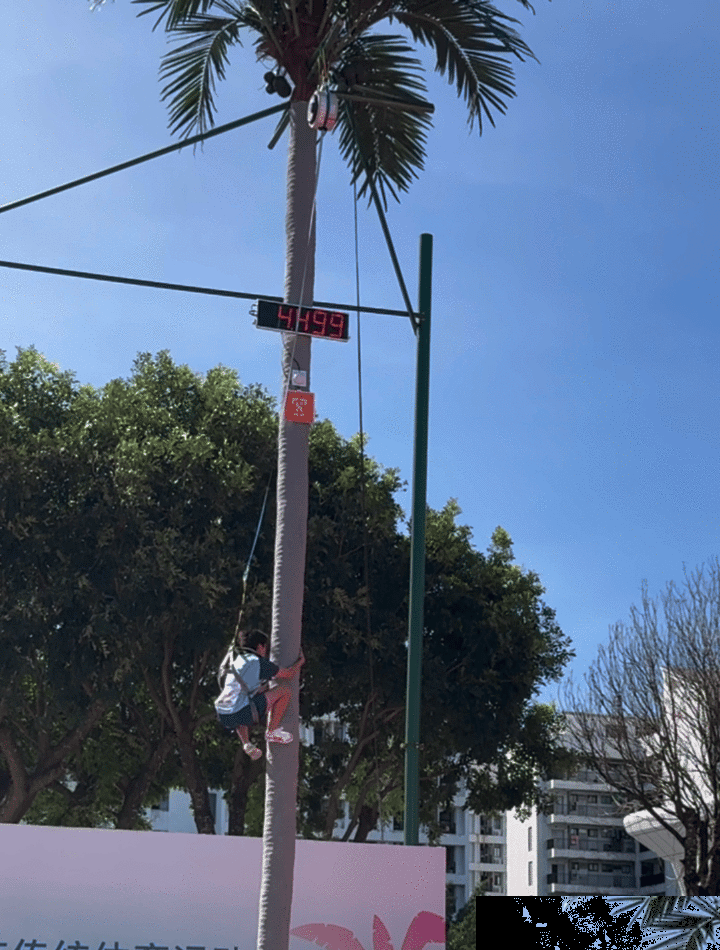 攀椰競速設立男子攀椰9米競速和女子攀椰7米競速兩個項目,比賽要求運動員使用統(tǒng)一提供的攀椰運動用具,徒手攀爬至椰樹頂部并按下計時器,用時短者獲勝。
