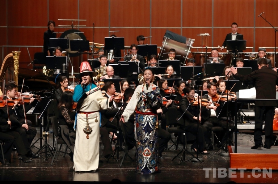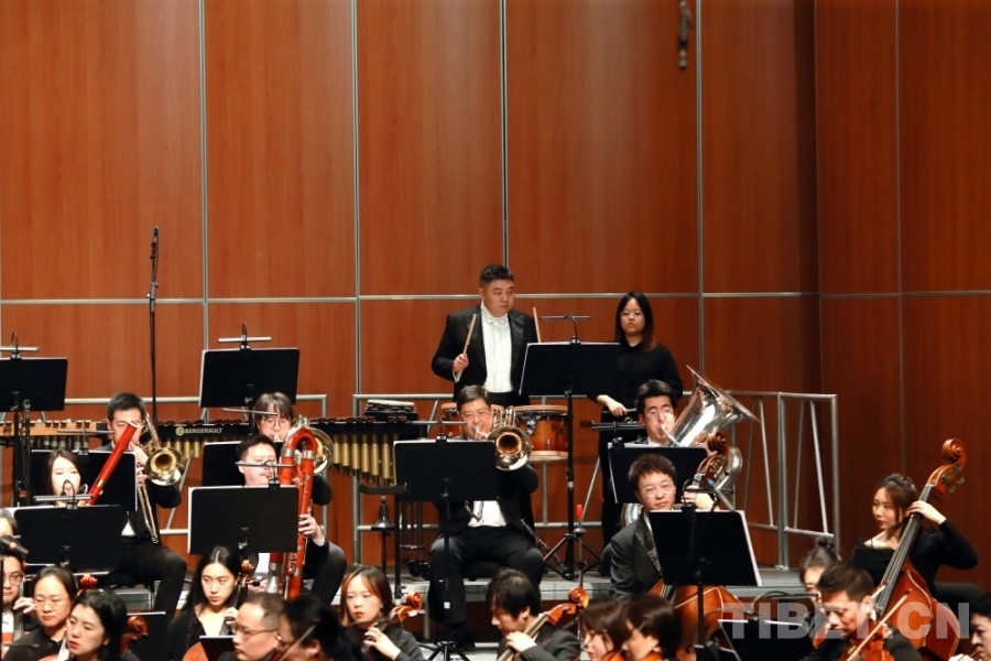 音樂會上,兩位藏族歌手演唱了交響樂主題曲《金橋》,歌曲高亢嘹亮、曲調(diào)悠揚。藏戲、山歌等元素的加入,讓交響樂更加豐富,充滿了濃郁的民族風情。
