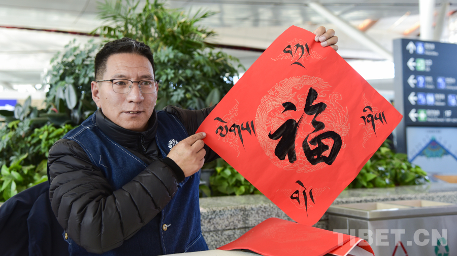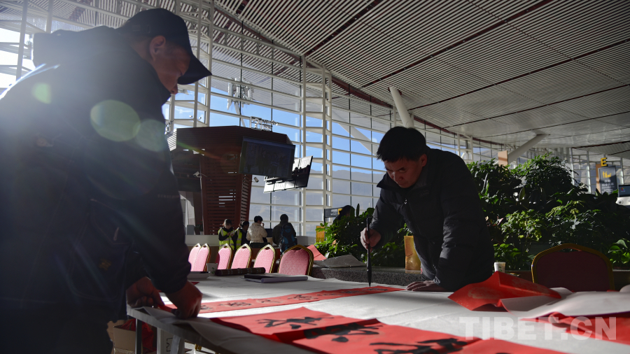活動(dòng)現(xiàn)場(chǎng),29名西藏文藝志愿者走進(jìn)拉薩貢嘎國際機(jī)場(chǎng)航站樓,開展送“?!弊?、送“扎西德勒”、送春聯(lián)、扎木念彈唱等活動(dòng),為過往旅客和工作人員帶來了一場(chǎng)別開生面的文化體驗(yàn)。