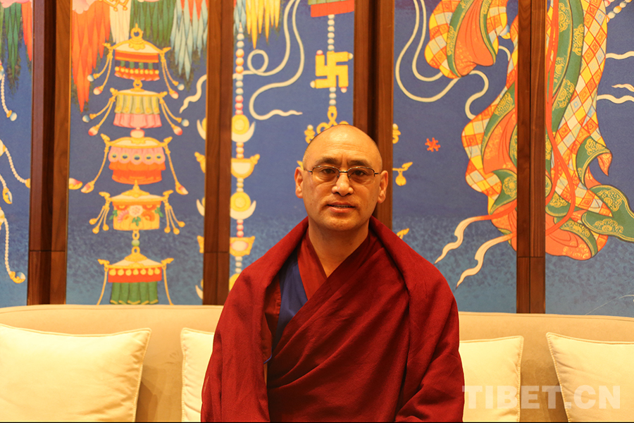 圖為藏傳佛教第十六屆“拓然巴”高級學(xué)銜獲得者、旺達(dá)寺民管會主任澤翁巴登接受記者采訪 攝影:龍真多吉