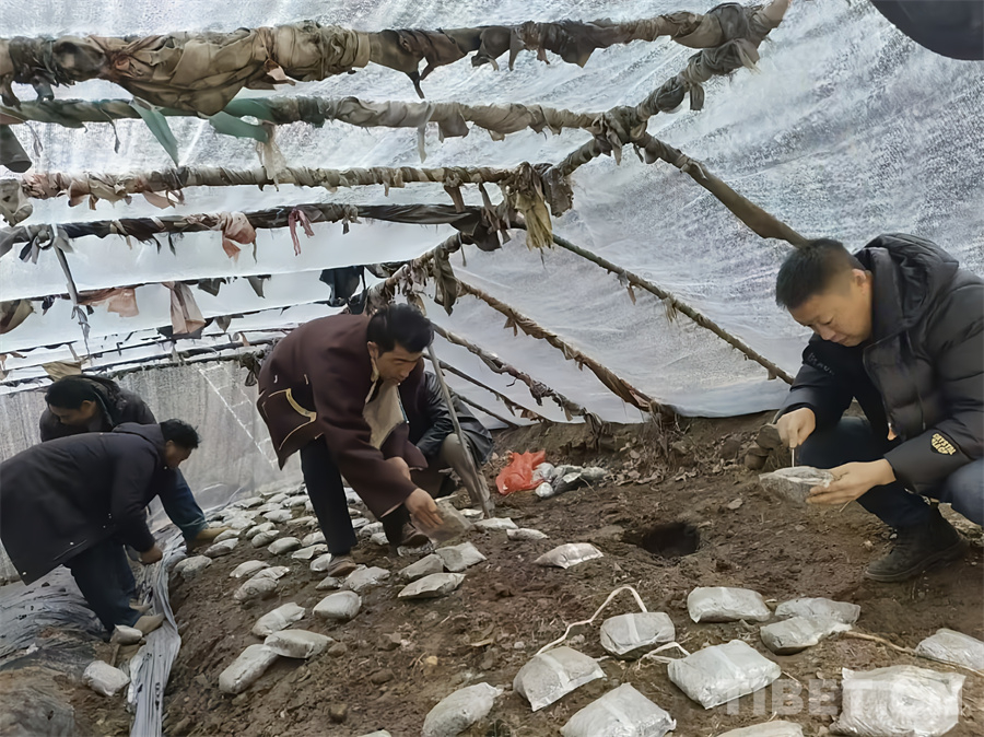 圖為昌都市農(nóng)業(yè)科學(xué)研究所工作人員為羊肚菌擺放外源營養(yǎng)袋,為菌絲生長補(bǔ)充營養(yǎng)