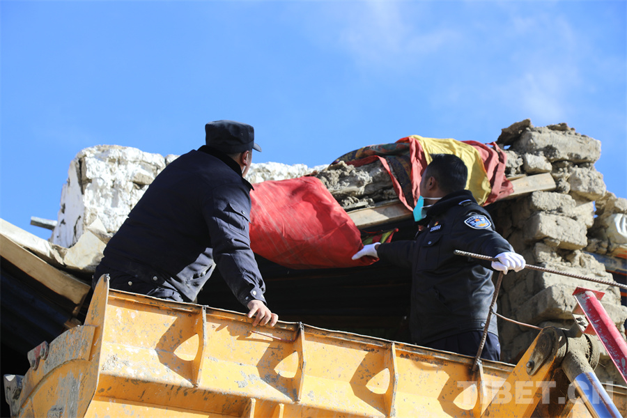 圖為拉孜縣公安民警在曲下鎮(zhèn)吉如村進(jìn)行救援工作 攝影:格桑羅布