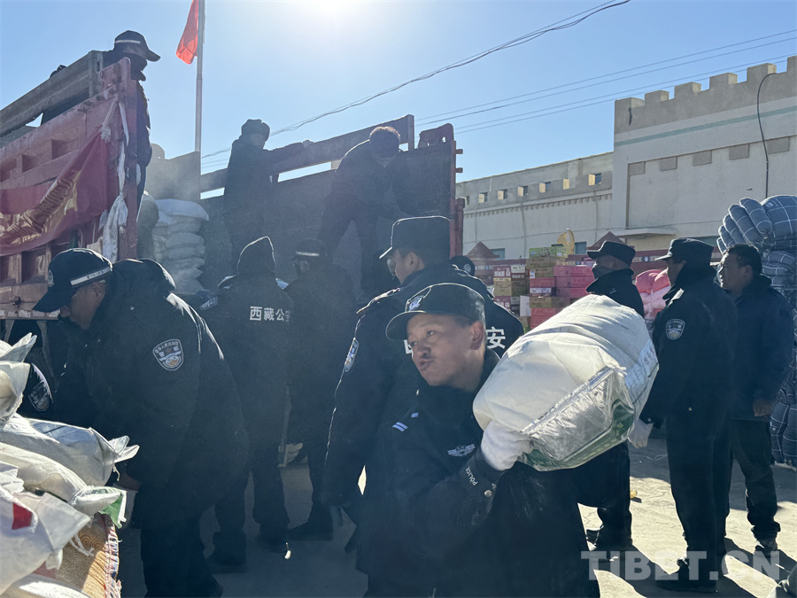 圖為仁布縣公安民警在定日縣曲洛鄉(xiāng)措昂村搬運(yùn)救援物資 攝影:旦增