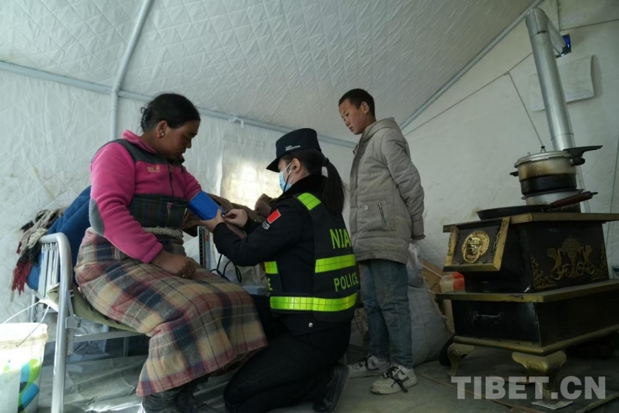 圖為在西藏定日縣長所鄉(xiāng)玉白村安置點,定日邊境管理大隊民警黃曉娟正在給災區(qū)群眾量血壓 攝影:蔣美靈