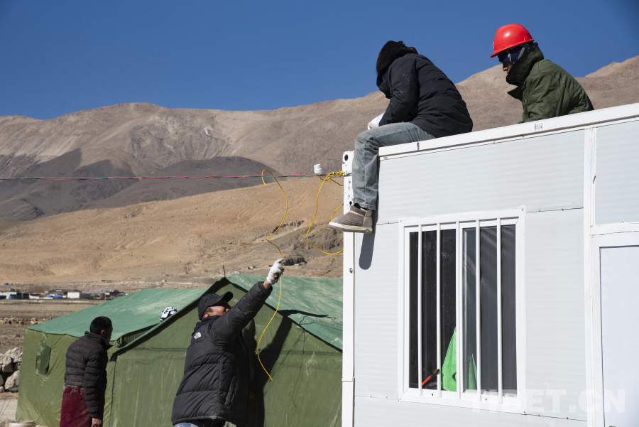 圖為工作人員正在受災(zāi)僧尼安置點(diǎn)活動(dòng)板房外安裝照明設(shè)備 攝影:趙振宇