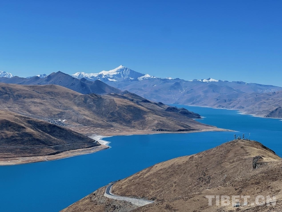 圖為湛藍的羊卓雍錯和乃欽康桑雪山交相輝映,構成一幅美麗動人的畫卷。攝影:德吉卓瑪