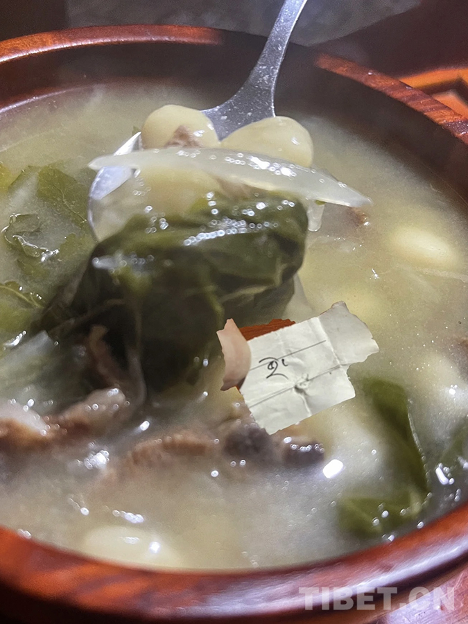 到了晚上,家人們會圍聚在一起吃“古突”——一種面疙瘩湯。在制作過程中,我們會在面皮里包一些有著特殊寓意的物品,例如:辣椒、羊毛、鹽巴、花椒等。在吃飯時,吃到不同東西的人要當場說出自己吃到的是什么,并對其中的寓意做講解,同時表達自己在新的一年的愿望、期盼和目標。這個活動不僅給家人們帶來祝福,最重要的是增添了歡樂的氛圍。