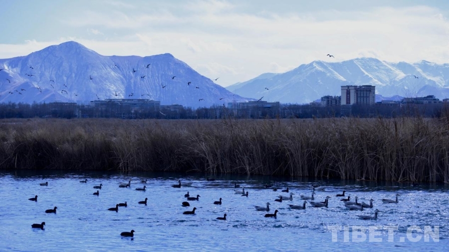圖為在拉魯濕地湖泊中覓食的鴨群和遠處雪景形成一幅美麗的畫卷 攝影:德吉卓瑪