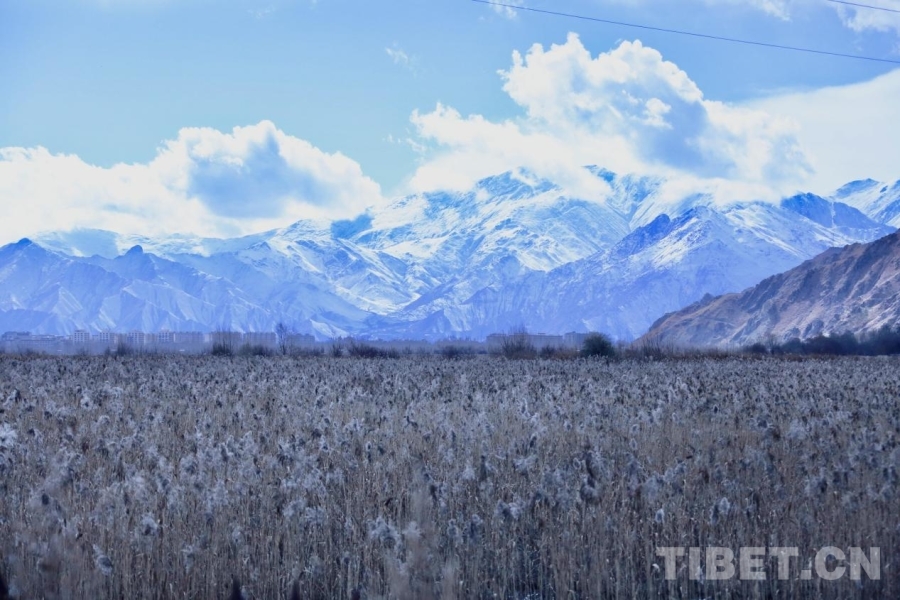 圖為從拉魯濕地遠眺遠處銀裝素裹的山巒 攝影:德吉卓瑪