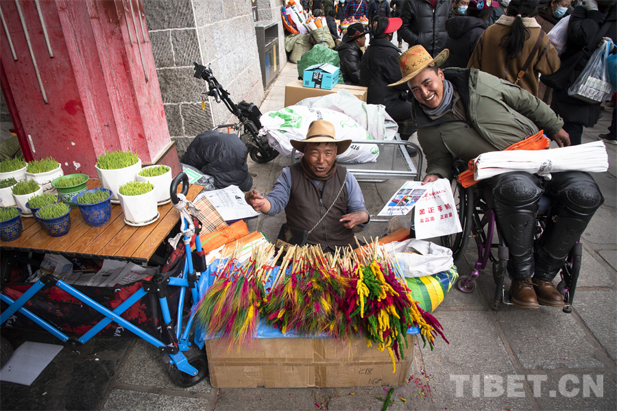 普瓊,來自日喀則市江孜縣,在八廓商城南門前經(jīng)營著自己的“羅薩梅朵”小攤。初見普瓊,我們被他沖著鏡頭的燦爛笑容所吸引。細細觀察,普瓊坐在地上的身高卻比別人矮了一大截?!拔覀儚睦_堆龍德慶的批發(fā)市場上買來這批‘羅薩梅朵’在此銷售,就希望能夠在年前的這段時間多賺些小錢補貼家用,所有人都想在新年之時過個充裕的‘好年’,不是嗎?”普瓊因一次意外高位截癱,失去雙腿的他并沒有消沉。他選擇積極面對生活,用自己的雙手和命運抗爭,用堅強和勤勞讓自己和全家過上更好的生活。與普瓊不幸的經(jīng)歷相比,我們每個人過的每個年何嘗不都是一個個“好年”呢?普瓊對生活的那種熱愛,對明天會更好的堅定,何嘗不是我們對每一個“好年”所孜孜追求的呢?