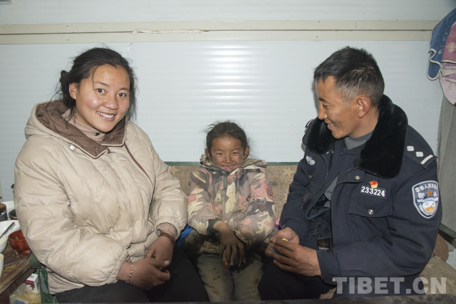 圖為次仁玉珍(左)和扎西(右)看望村民格桑的小女兒達(dá)瓦曲吉 攝影:趙振宇