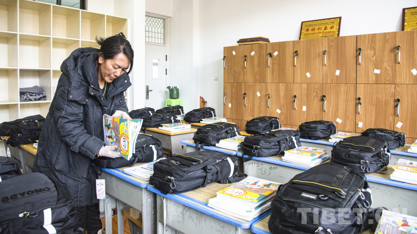 圖為定日縣措果鄉(xiāng)中心小學(xué)黨支部書記卓嘎正在為返校學(xué)生提前發(fā)放教材 攝影:趙振宇