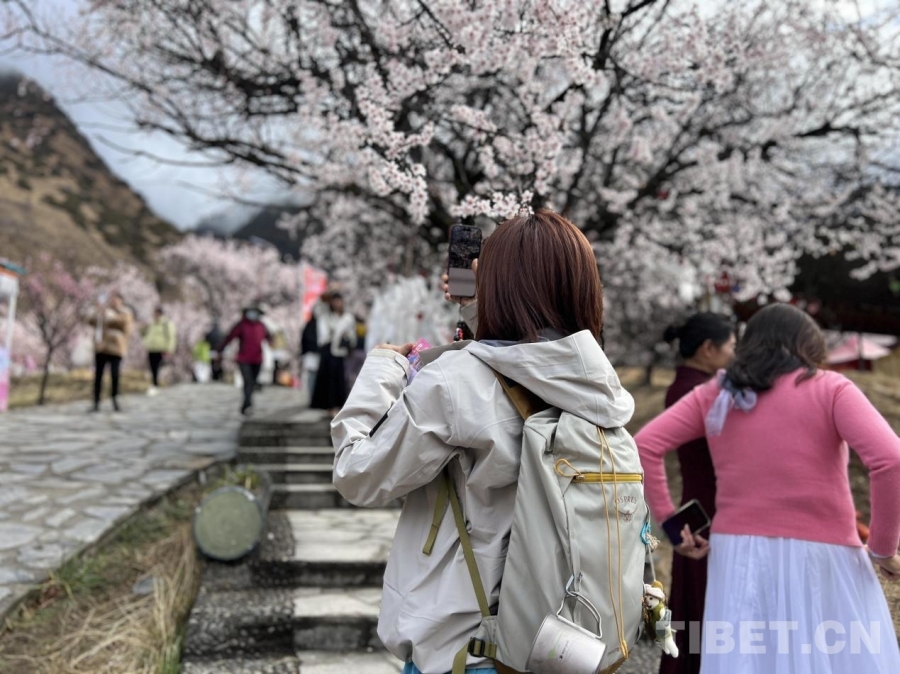 圖為游客在嘎拉桃花村欣賞桃花攝影:德吉卓瑪(2024年4月3日攝)