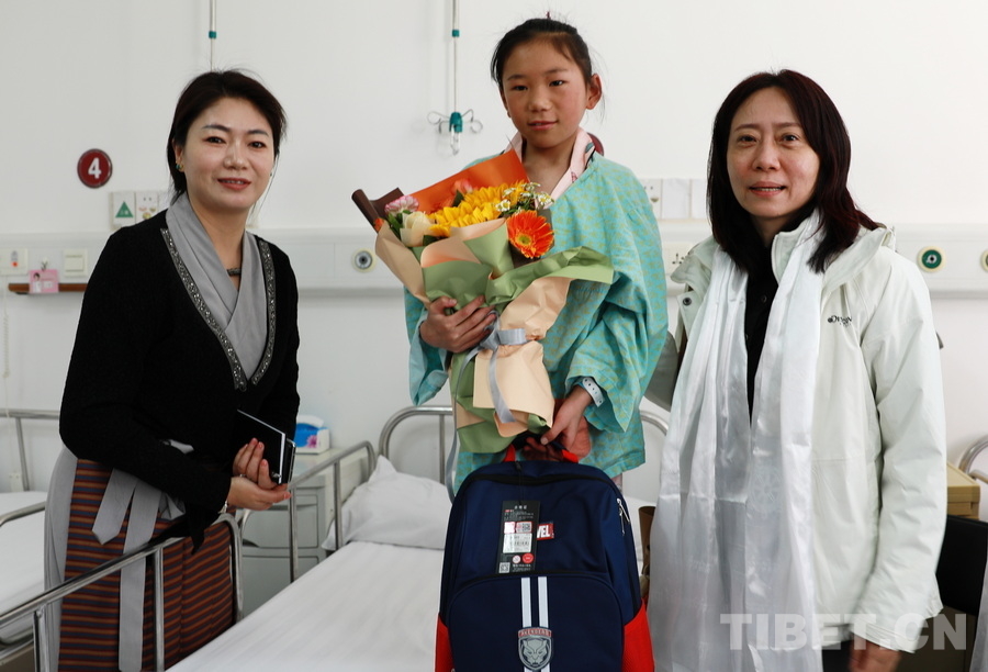 圖為北京啟明星辰慈善公益基金會(huì)理事長(zhǎng)王?,摚ㄓ乙唬┡c四川省甘孜州石渠縣衛(wèi)健局副局長(zhǎng)向巴啟西(左一)向在北京朝陽(yáng)醫(yī)院接受救治的四川省甘孜州石渠縣脊柱側(cè)彎患兒贈(zèng)送鮮花與學(xué)習(xí)用品 攝影:劉莉