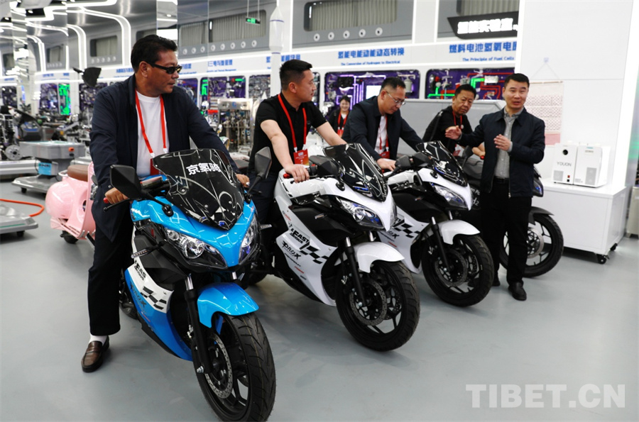 圖為西藏自治區(qū)工商聯(lián)民營企業(yè)家赴京學(xué)習(xí)參觀團(tuán)一行體驗(yàn)氫能摩托車 攝影:劉莉