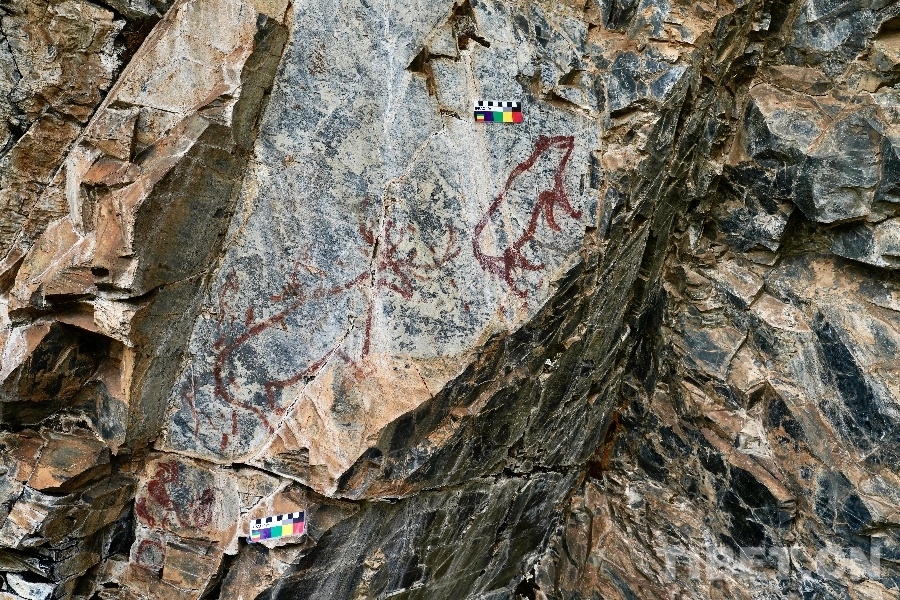 圖為2023年6月22日拍攝的甘孜州“海子山-格聶巖畫群”阿莎貢嘎巖畫上美麗的大角鹿圖像