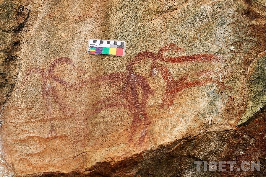 周行康:西藏7地市里,阿里地區(qū)的巖畫得到比較早的發(fā)現與重視,20世紀90年代考古學家在做其他考古項目時發(fā)現了這個現象并進行了一定的研究,然后是包括那曲在內的廣義羌塘地區(qū)。青海玉樹州的巖畫在十年前開始得到比較多的重視,主要是本地的藏族同志在認真地調查研究。最近三、四年,甘孜州的巖畫在當地政府重視、專家學者的參與下進入上升趨勢,甘孜州涂繪類巖畫的測年工作是走在青藏高原巖畫研究前列的。目前看青藏高原西、中、東三個重要點位已具備規(guī)模和形態(tài)。