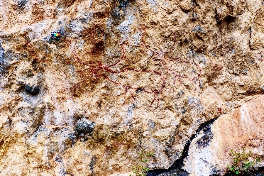周行康:2023年6月,在海子山管委會巡山團隊提供線索指引下,經過數次實地調查,我們在“海子山-格聶”區(qū)域發(fā)現了紅顏料涂繪類巖畫群。通過邀請國內考古權威機構來現場采樣、并經實驗室測定,我們確認這批巖畫是距今8000年前的古老創(chuàng)作。目前從世界范圍來看,石刻類巖畫的測年還沒有得到一個有效的解決,青藏高原的石刻類巖畫,一般推斷為距今3000多年,因而這批更久遠的舊石器時代的“海子山-格聶”巖畫就顯得更有意義,而且它是目前已知的世界上同類風格巖畫中海拔最高的巖畫——位于海拔4721米的高度。