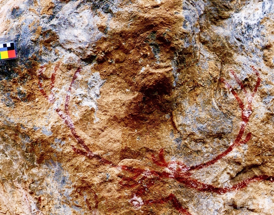 圖為2023年6月24日拍攝的甘孜州“海子山-格聶巖畫群”海1巖畫中獨特的野豬、人物、爪印圖像