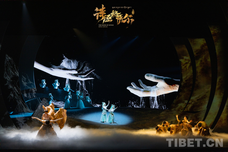 這部融合了《詩經(jīng)》與《格薩爾》兩大文化瑰寶的劇目,以中原地區(qū)最古老的詩歌總集《詩經(jīng)》和目前世界上最長的史詩《格薩爾》為藍(lán)本,創(chuàng)作出一部瑰麗雄壯且充滿想象力的作品,將深厚的中華文明精粹進(jìn)行了精巧融合和詩意表達(dá)。創(chuàng)作過程中,《詩經(jīng)》和《格薩爾》兩部作品中相同、相似、接近的圖騰、樂器、歌舞、生活習(xí)性等文化元素被巧妙串聯(lián)起來,以“同、融、美”為意象連接點,通過數(shù)字手段打造的絕美舞臺效果,真正實現(xiàn)了“美美與共”。