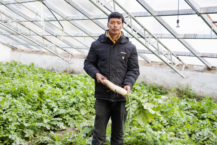 圖為定日縣長(zhǎng)所鄉(xiāng)嘎旦村村委會(huì)主任頓珠在震后修繕的蔬菜溫室大棚內(nèi)為記者展示棚內(nèi)種植出的白蘿卜 攝影:趙振宇